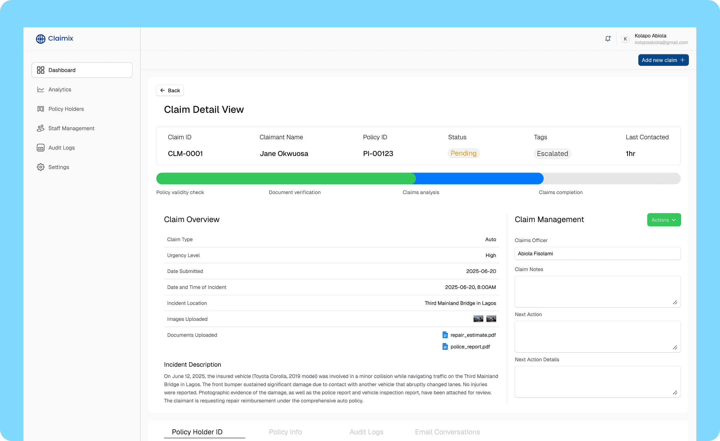 Claimix project is a web-based claims processing system designed to help insurance teams manage and act on incoming claims more efficiently. The system automatically intakes claims sent by email, uses OCR and AI (LLMs) to extract key information, and then presents everything to staff through a real-time dashboard. Claims officers can review, edit, approve, reject, ask for more information, or escalate claims. All activities are visible on the interface and trackable in an audit log.