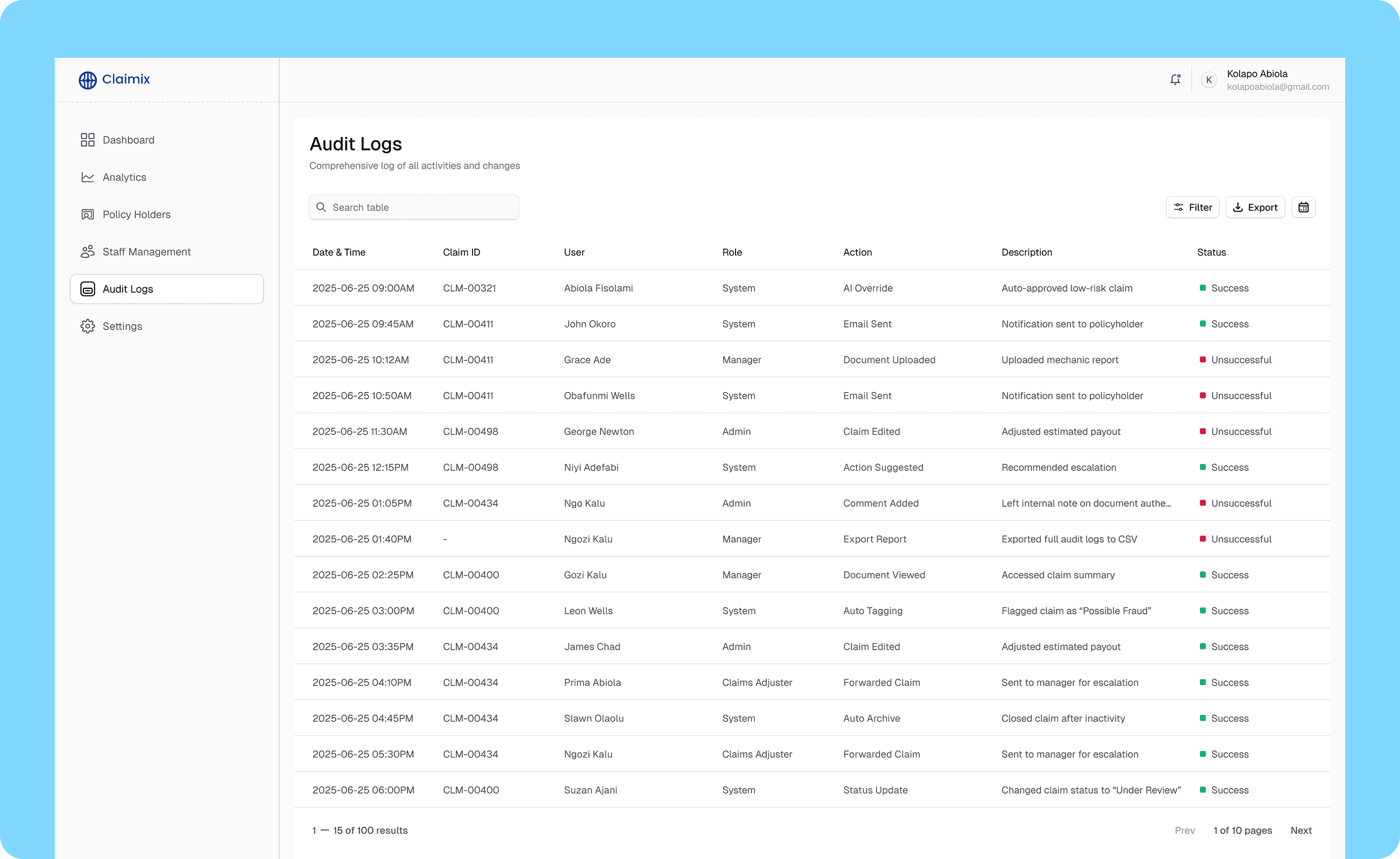To support trust and accountability, an Audit Log system runs alongside the policy holder experience. Every action taken on a claim including submission, review, edits, requests for information, approvals, rejections, and escalations is automatically recorded with timestamps and user identifiers.