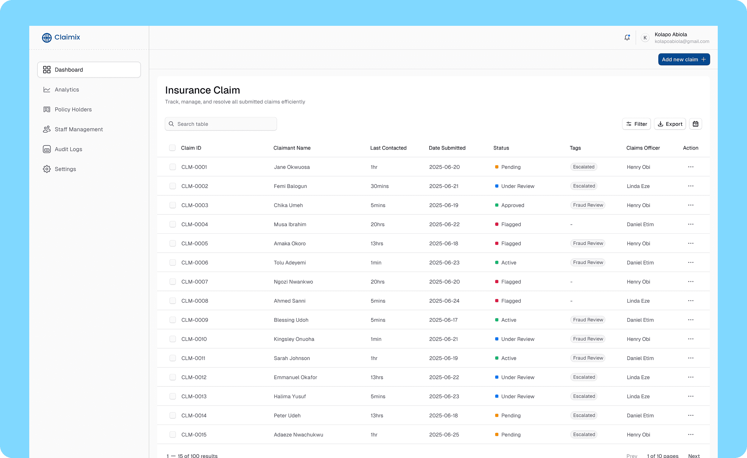 The dashboard shows a list of claims, details for each claim, and additional views like policyholder info, analytics, audit logs, and staff management. Role-based access ensures only authorised users can take specific actions.