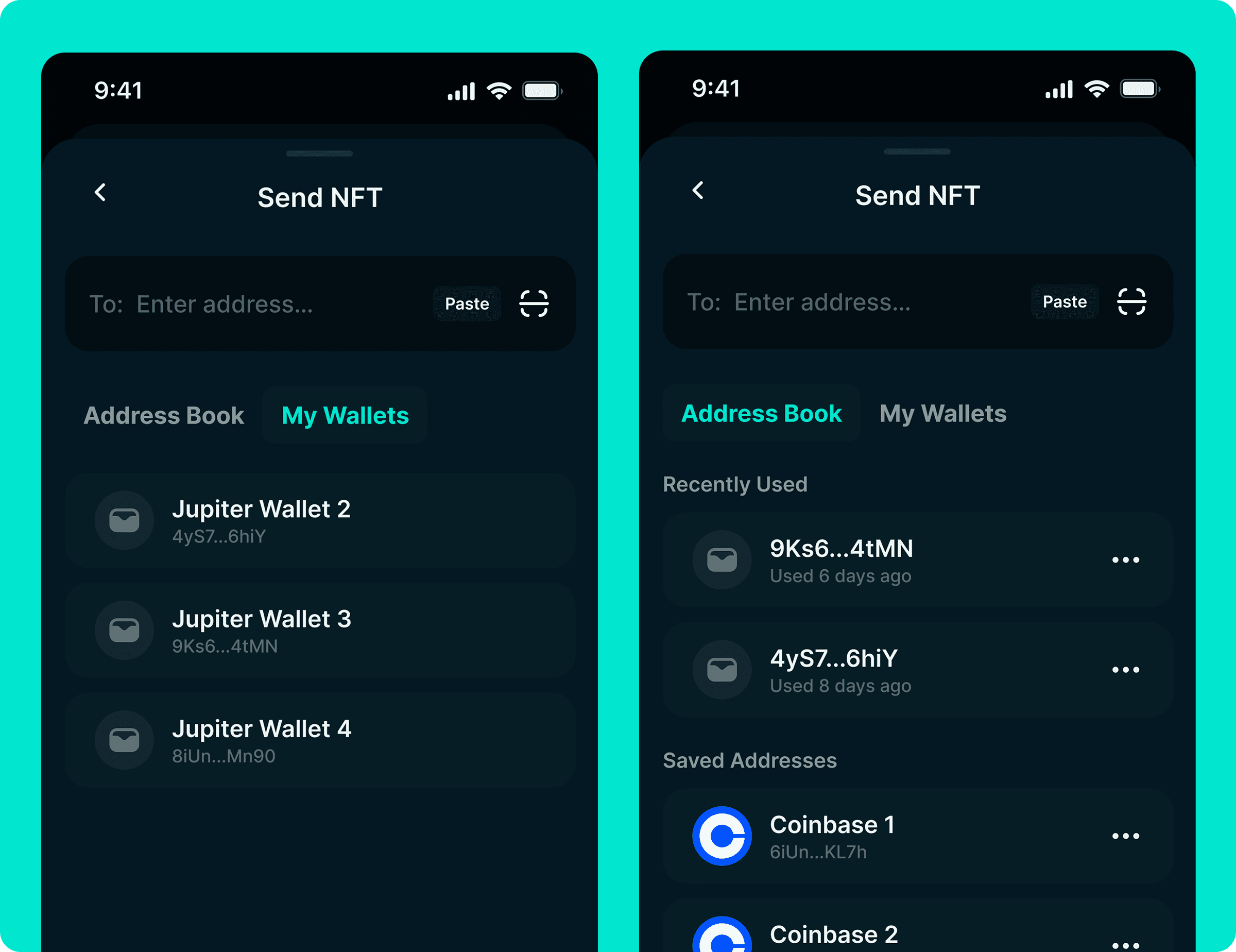 Each option is surfaced naturally in the flow so users are never forced into manual input. The result is a Send NFT experience that feels intentional, and easy at every step.