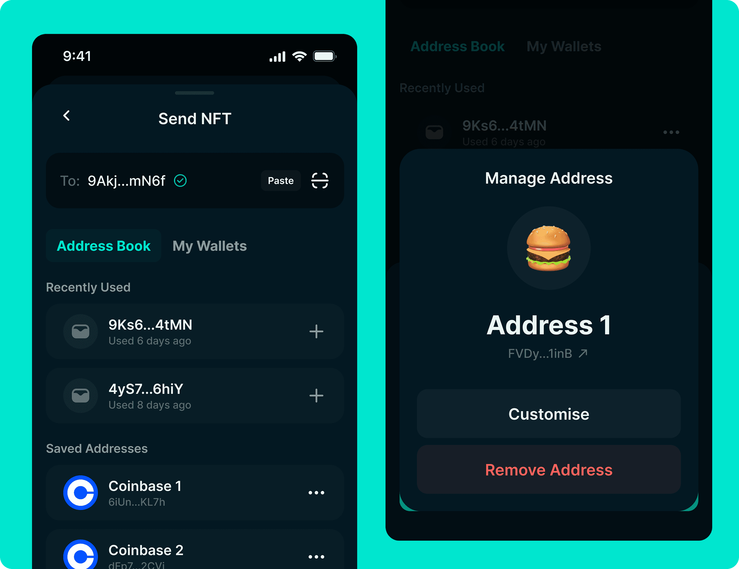 To make entering a destination effortless, users can scan a QR code, select an address from their address book, or quickly send the NFT to one of their other wallets.
